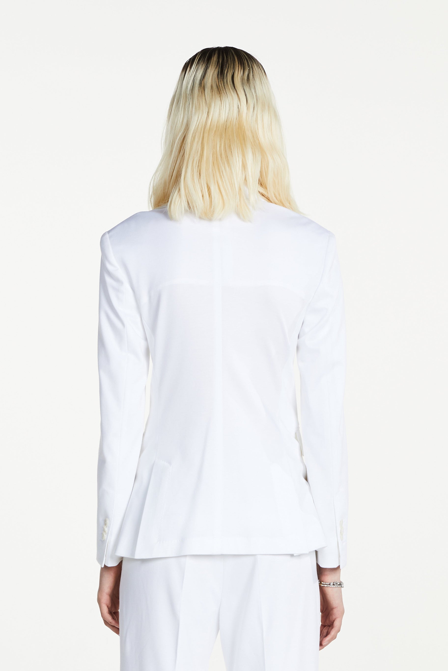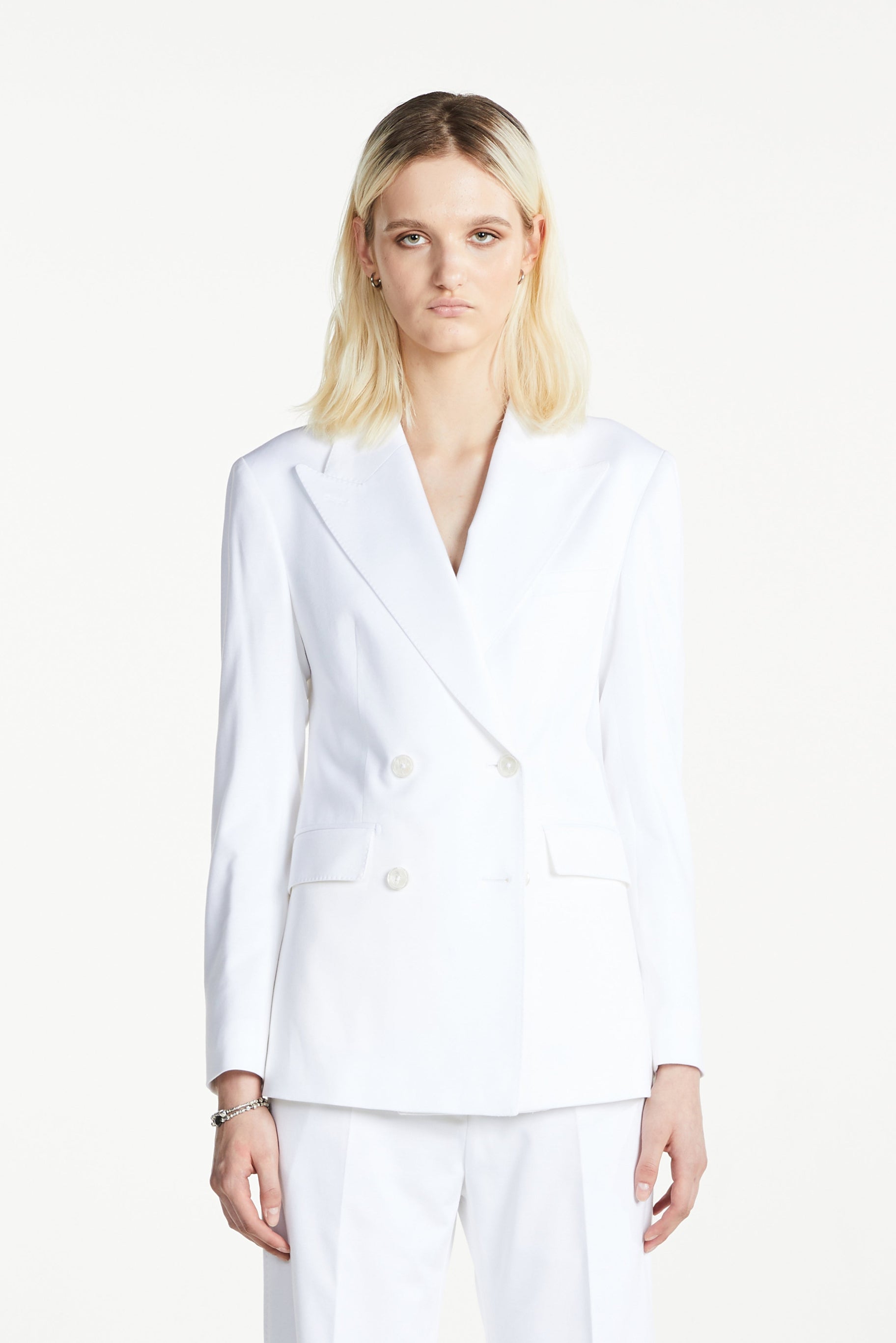 For evening, let contrast do the work: pair the jacket with a black camisole or high-waisted black trousers, adding considered jewellery and a slim heel for a refined, graphic silhouette. For off-duty days, drop the formality—wear the jacket over a simple T-shirt and denim with loafers or boots. The suit stays the same, the mood shifts: from office to dinner, weekday to weekend, always precise, never overdone.